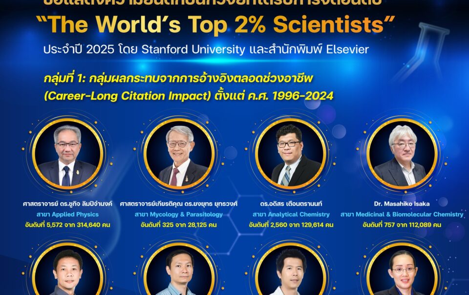 - ขอแสดงความยินดีกับนักวิจัยไบโอเทค สวทช. ที่ได้รับการจัดอันดับเป็นหนึ่งใน “The World’s Top 2% Scientists” ประจำปี 2025 โดย Stanford University ร่วมกับ สำนักพิมพ์ Elsevier10/03/2025