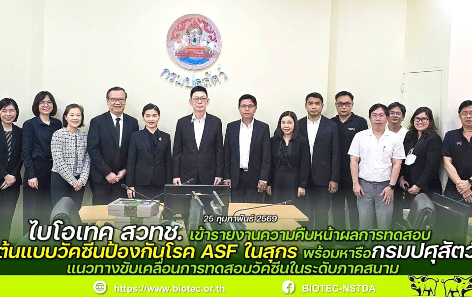 - ไบโอเทค สวทช. รายงานความก้าวหน้าผลการทดสอบต้นแบบวัคซีนป้องกันโรค ASF ในสุกร พร้อมหารือกรมปศุสัตว์ขับเคลื่อนการทดสอบวัคซีนในระดับภาคสนาม03/10/2026