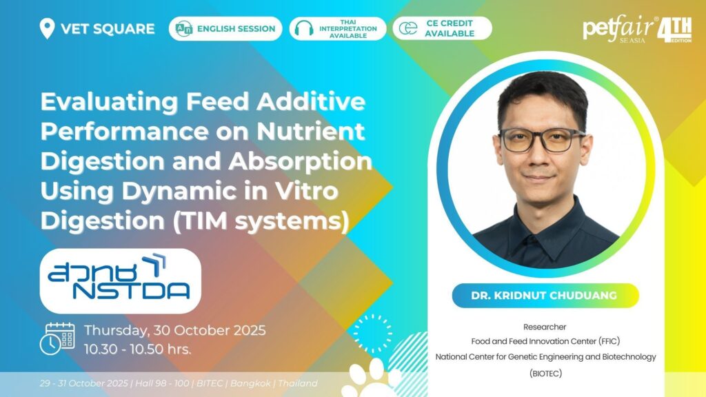 โอกาสนี้นักวิจัยไบโอเทค ดร.กฤตณัฐ ชูดวง ทีมวิจัยเทคโนโลยีชีวภาพทางอาหาร กลุ่มวิจัยส่วนผสมฟังก์ชั่นและนวัตกรรมอาหาร ร่วมบรรยายในหัวข้อ Evaluating Feed Additive Performance on Nutrient Digestion and Absorption Using Dynamic in Vitro Digestion (TIM systems)” ในวันที่ 30 ตุลาคม 2568 เวลา 10.30 – 10.50 น. ณ เวที Vet Square Hall 98 – 100 ไบเทค บางนา กรุงเทพฯ ด้วย ซึ่งเป็นหนึ่งในบริการของ FoodSERP ที่จำลองสภาวะที่เกิดขึ้นจริงในกระเพาะอาหารต่อเนื่องไปถึงลำไส้เล็ก และลำไส้ใหญ่ ระบบสามารถถูกปรับให้จำลองสภาวะที่พบในคนต่างวัย (เด็ก ผู้ใหญ่ ผู้สูงอายุ) และในสัตว์กระเพาะเดี่ยว (สุนัข แมว)
