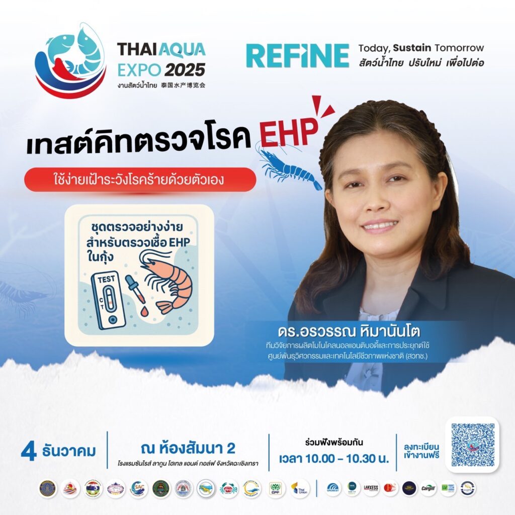 ขอเชิญผู้ประกอบการฟาร์มกุ้งและผู้สนใจ มาร่วมเรียนรู้เทคนิคการเฝ้าระวังโรค EHP ด้วยชุดตรวจง่าย ๆ ที่จะช่วยให้ควบคุมคุณภาพและผลผลิตได้ ในงาน THAI AQUA EXPO 2025