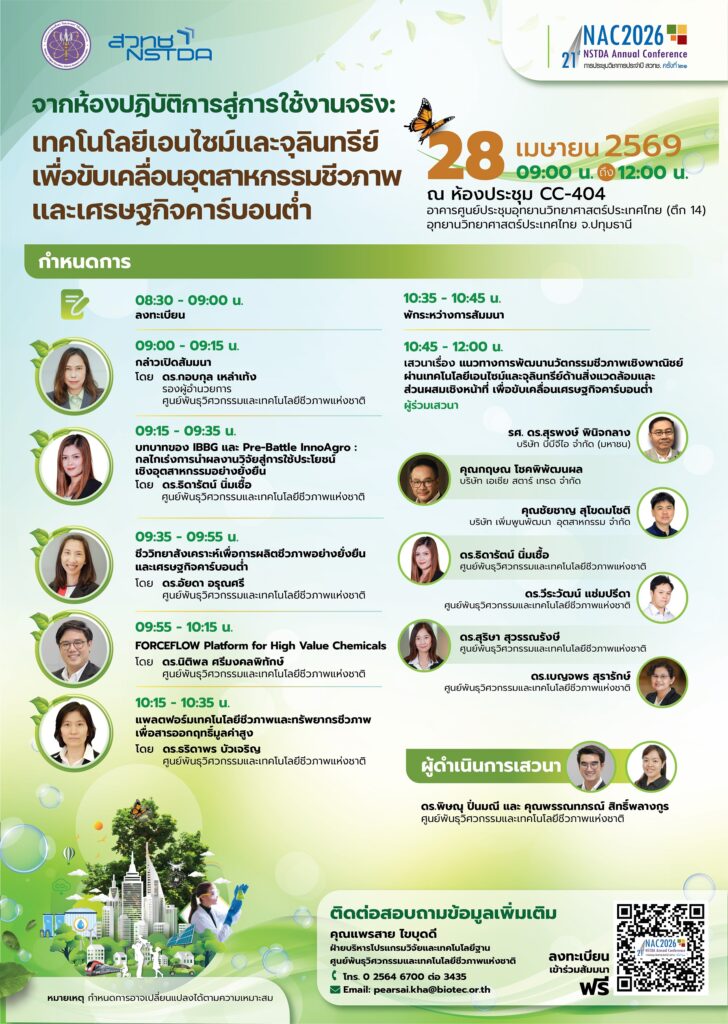 ศูนย์พันธุวิศวกรรมและเทคโนโลยีชีวภาพแห่งชาติ (ไบโอเทค) สวทช. ขอเชิญชวนทุกท่านเข้าร่วมการสัมมนาเรื่อง จากห้องปฏิบัติการสู่การใช้งานจริง: เทคโนโลยีเอนไซม์และจุลินทรีย์เพื่อขับเคลื่อนอุตสาหกรรมชีวภาพและเศรษฐกิจคาร์บอนต่ำ ภายใต้การประชุมประจำปี 2569 สวทช.