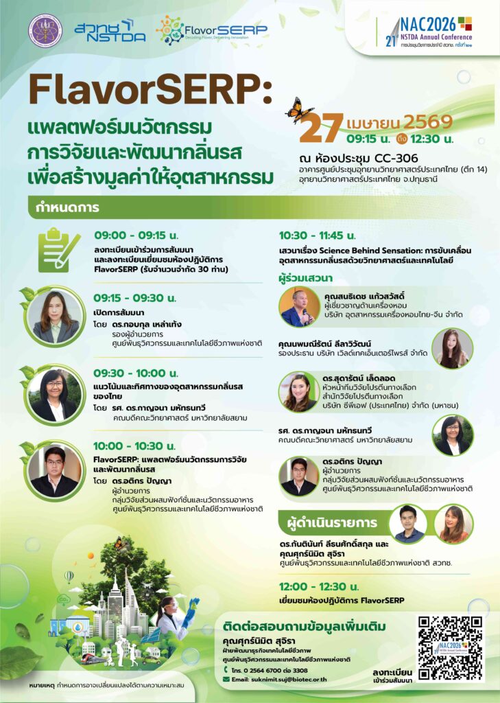 ศูนย์พันธุวิศวกรรมและเทคโนโลยีชีวภาพแห่งชาติ (ไบโอเทค) สวทช. ขอเชิญผู้บริหาร นักวิจัย และผู้ประกอบการในอุตสาหกรรมอาหารและอาหารสัตว์ ร่วมเปิดตัวและเจาะลึก FlavorSERP แพลตฟอร์มบูรณาการนวัตกรรมวิจัยกลิ่นรสที่ครบวงจรที่สุด เพื่อยกระดับผลิตภัณฑ์ของคุณสู่มาตรฐานสากล และเข้าร่วมการสัมมนาเรื่อง “FlavorSERP: แพลตฟอร์มนวัตกรรมการวิจัยและพัฒนากลิ่นรสเพื่อสร้างมูลค่าให้อุตสาหกรรม” ภายใต้การประชุมประจำปี 2569 สวทช. (NAC2026)