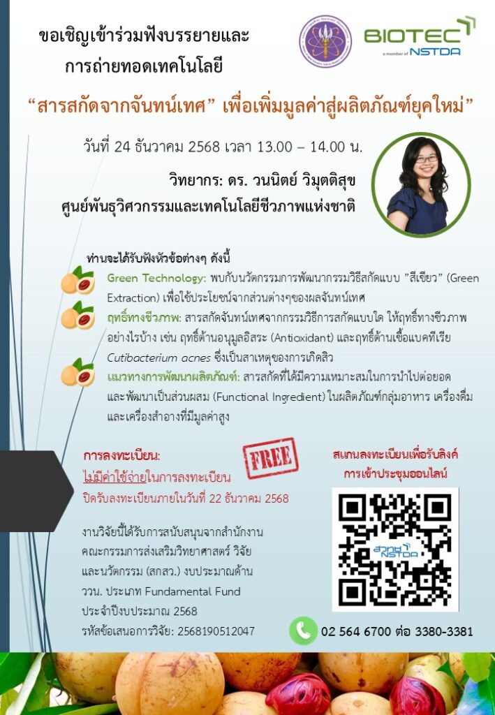 ศูนย์พันธุวิศวกรรมและเทคโนโลยีชีวภาพแห่งชาติ (ไบโอเทค) สำนักงานพัฒนาวิทยาศาสตร์และเทคโนโลยีแห่งชาติ (สวทช.) ขอเชิญผู้สนใจเข้าร่วมรับฟังการบรรยายพิเศษและถ่ายทอดเทคโนโลยี ในหัวข้อ “สารสกัดจากจันทน์เทศ เพื่อเพิ่มมูลค่าสู่ผลิตภัณฑ์ยุคใหม่” ซึ่งเป็นผลงานวิจัยที่ได้รับการสนับสนุนจากสำนักงานคณะกรรมการส่งเสริมวิทยาศาสตร์ วิจัยและนวัตกรรม (สกสว.)