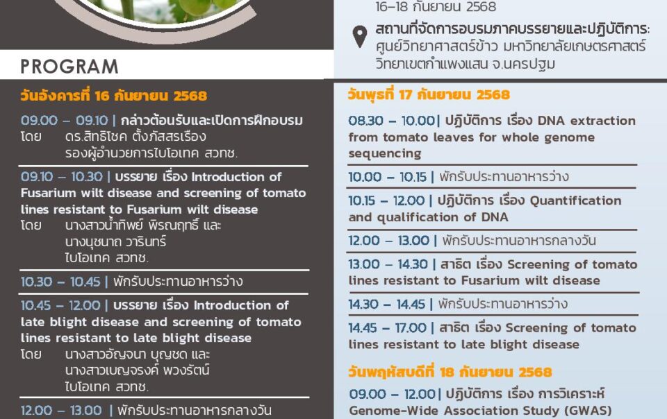 ไบโอเทค เปิดรับสมัคร! หลักสูตรอบรมเชิงปฏิบัติการ “การค้นหายีนต้านทานต่อโรคเหี่ยวเหลืองและโรคใบไหม้ในมะเขือเทศโดยเทคนิค GWAS”