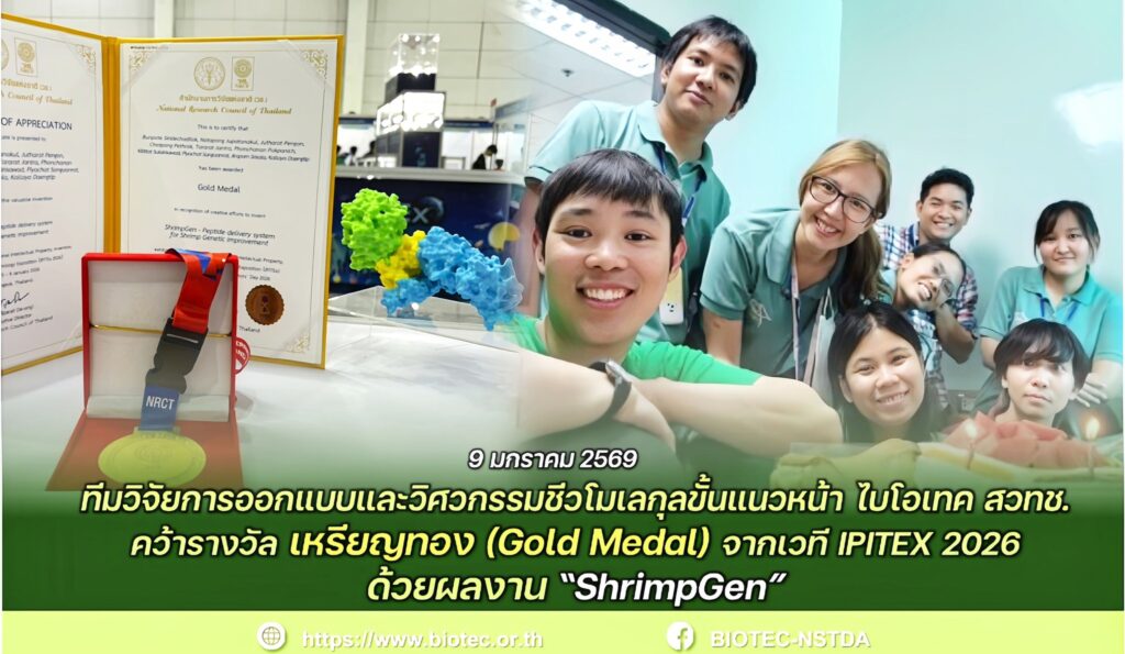 ศูนย์พันธุวิศวกรรมและเทคโนโลยีชีวภาพแห่งชาติ (ไบโอเทค) สำนักงานพัฒนาวิทยาศาสตร์และเทคโนโลยีแห่งชาติ (สวทช.)ขอร่วมแสดงความยินดีกับ ทีมวิจัยการออกแบบและวิศวกรรมชีวโมเลกุลขั้นแนวหน้า ในโอกาสที่ผลงานวิจัยและนวัตกรรม “ShrimpGen – Peptide delivery system for Shrimp Genetic Improvement” ได้รับรางวัลเหรียญทอง (Gold Medal) จากการประกวดสิ่งประดิษฐ์และนวัตกรรมนานาชาติ 2026 Bangkok International Intellectual Property, Invention, Innovation and Technology Exposition (IPITEX 2026)ซึ่งจัดโดย สำนักงานการวิจัยแห่งชาติ (วช.) – National Research Council of Thailand (NRCT) ระหว่างวันที่ 5-9 มกราคม 2569 ณ ศูนย์นิทรรศการและการประชุมไบเทค บางนา