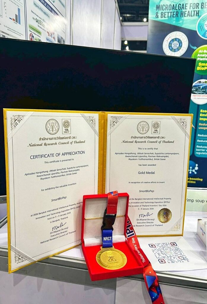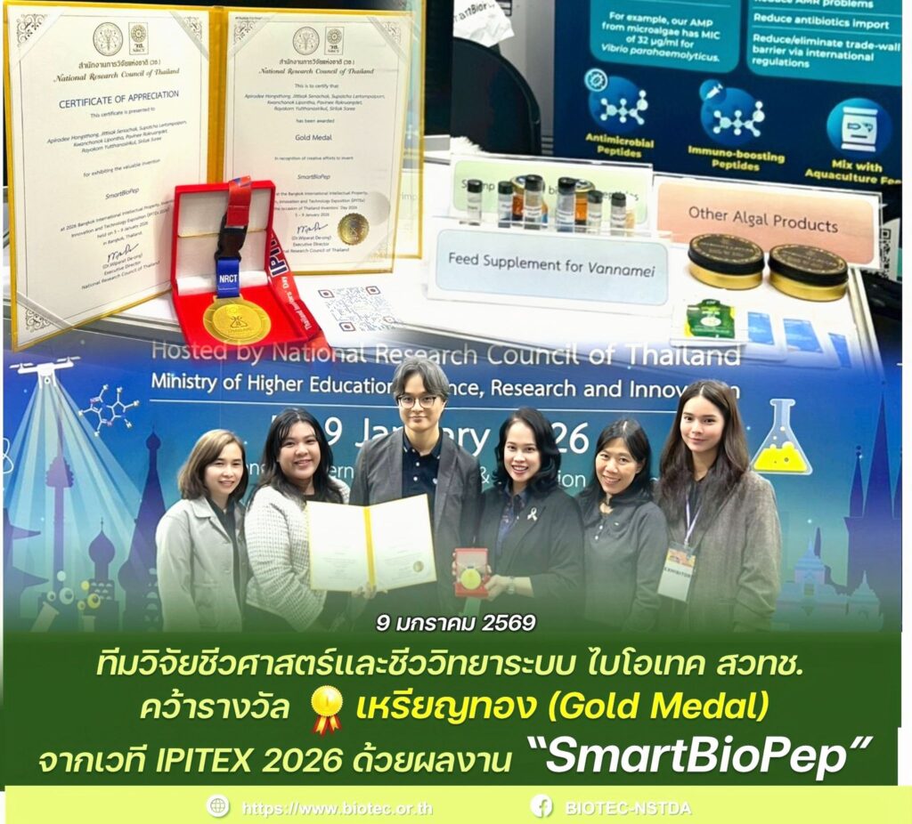 ศูนย์พันธุวิศวกรรมและเทคโนโลยีชีวภาพแห่งชาติ (ไบโอเทค) สำนักงานพัฒนาวิทยาศาสตร์และเทคโนโลยีแห่งชาติ (สวทช.) ขอร่วมแสดงความยินดีกับ ทีมวิจัยชีวศาสตร์และชีววิทยาระบบ ในโอกาสที่ผลงานวิจัยและนวัตกรรม “SmartBioPep” ได้รับ รางวัลเหรียญทอง (Gold Medal) จากการประกวดสิ่งประดิษฐ์และนวัตกรรมนานาชาติ 2026 Bangkok International Intellectual Property, Invention, Innovation and Technology Exposition (IPITEX 2026) ซึ่งจัดโดย สำนักงานการวิจัยแห่งชาติ (วช.) – National Research Council of Thailand (NRCT) ระหว่างวันที่ 5-9 มกราคม 2569 ณ ศูนย์นิทรรศการและการประชุมไบเทค บางนา