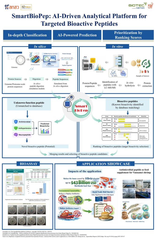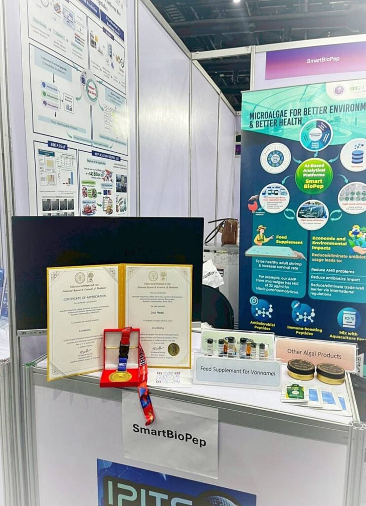 ผลงานที่ได้รับรางวัลเหรียญทอง (Gold Medal): SmartBioPep โดย SmartBioPep เป็นแพลตฟอร์มอัจฉริยะที่พัฒนาขึ้นเพื่อสนับสนุนการวิเคราะห์และคัดเลือกโมเลกุลชีวภาพ โดยเฉพาะกลุ่ม bioactive peptides จากแหล่งโปรตีนหลากหลายชนิด ด้วยการบูรณาการองค์ความรู้ด้าน ชีววิทยาระบบ (Systems Biology) เทคโนโลยีชีวสารสนเทศ และ ปัญญาประดิษฐ์ (AI) เข้าด้วยกันอย่างเป็นระบบ