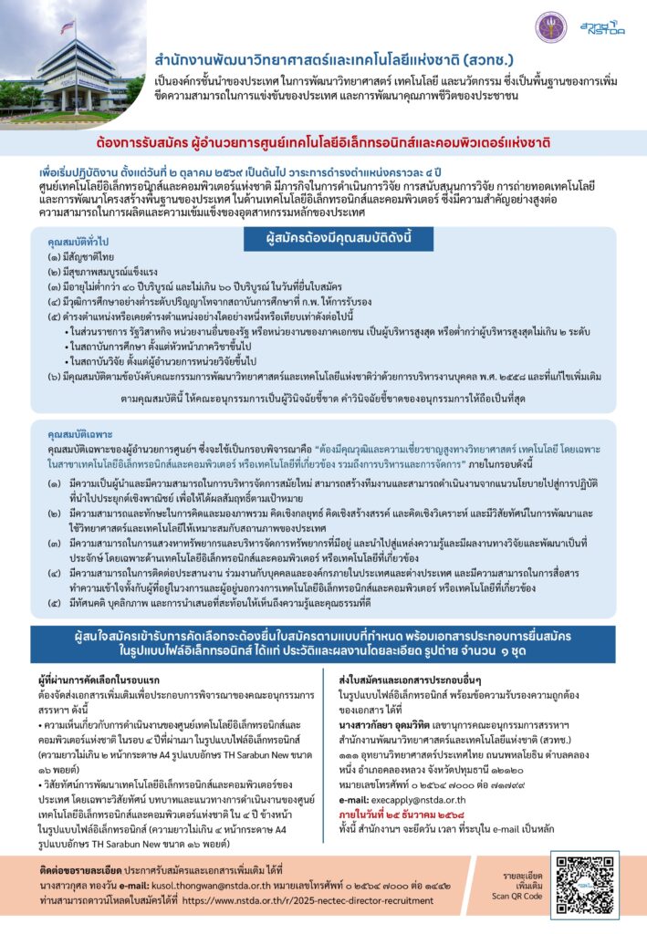 สำนักงานพัฒนาวิทยาศาสตร์และเทคโนโลยีแห่งชาติ จึงใคร่เชิญชวนผู้มีคุณสมบัติเหมาะสม สมัครเข้ารับการคัดเลือกเป็นผู้อำนวยการศูนย์เทคโนโลยีอิเล็กทรอนิกส์และคอมพิวเตอร์แห่งชาติ ตั้งแต่วันนี้ จนถึงวันที่ 25 ธันวาคม 2568