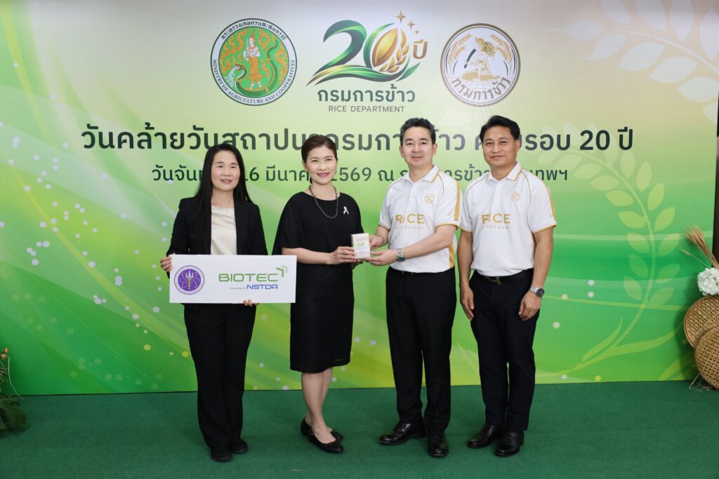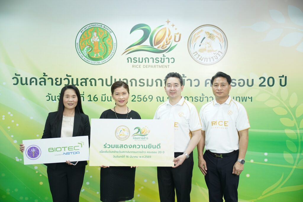 ผู้ช่วยศาสตราจารย์ ดร.เชาวรีย์ อรรถลังรอง ผู้อำนวยการศูนย์พันธุวิศวกรรมและเทคโนโลยีชีวภาพแห่งชาติ (ไบโอเทค) สำนักงานพัฒนาวิทยาศาสตร์และเทคโนโลยีแห่งชาติ (สวทช.) ร่วมเป็นเกียรติและแสดงความยินดีในงานวันสถาปนากรมการข้าว เนื่องในโอกาสครบรอบ 20 ปี โดยมีนายอานนท์ นนทรีย์ อธิบดีกรมการข้าว ให้การต้อนรับอย่างอบอุ่น ซึ่งงานดังกล่าวจัดขึ้นเมื่อวันจันทร์ที่ 16 มีนาคม 2569 ณ กรมการข้าว เขตจตุจักร กรุงเทพฯ
