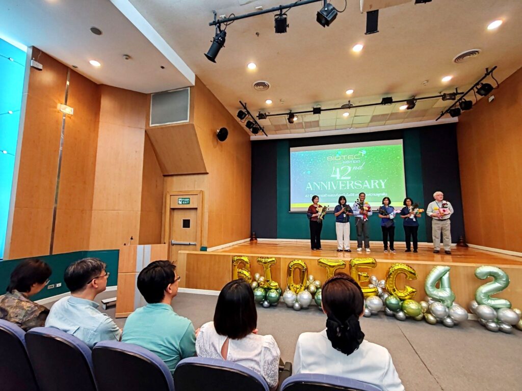 ศูนย์พันธุวิศวกรรมและเทคโนโลยีชีวภาพแห่งชาติ (ไบโอเทค) สำนักงานพัฒนาวิทยาศาสตร์และเทคโนโลยีแห่งชาติ (สวทช.) จัดกิจกรรมครบรอบการก่อตั้ง 42 ปี แห่งการสร้างสรรค์เทคโนโลยีชีวภาพ ควบคู่กับพิธีแสดงมุทิตาจิตแด่ผู้เกษียณอายุงาน ประจำปี 2568 ภายใต้หัวข้อ “วันวานที่พากเพียร สู่ความสุขเกษียณที่ภาคภูมิ” โดยมีผู้บริหาร นักวิจัย บุคลากร และแขกรับเชิญเข้าร่วมงานอย่างอบอุ่น เมื่อวันที่ 19 กันยายน 2568 ที่ผ่านมา ณ ห้องออดิทอเรียม อาคารไบโอเทค อุทยานวิทยาศาสตร์ประเทศไทย