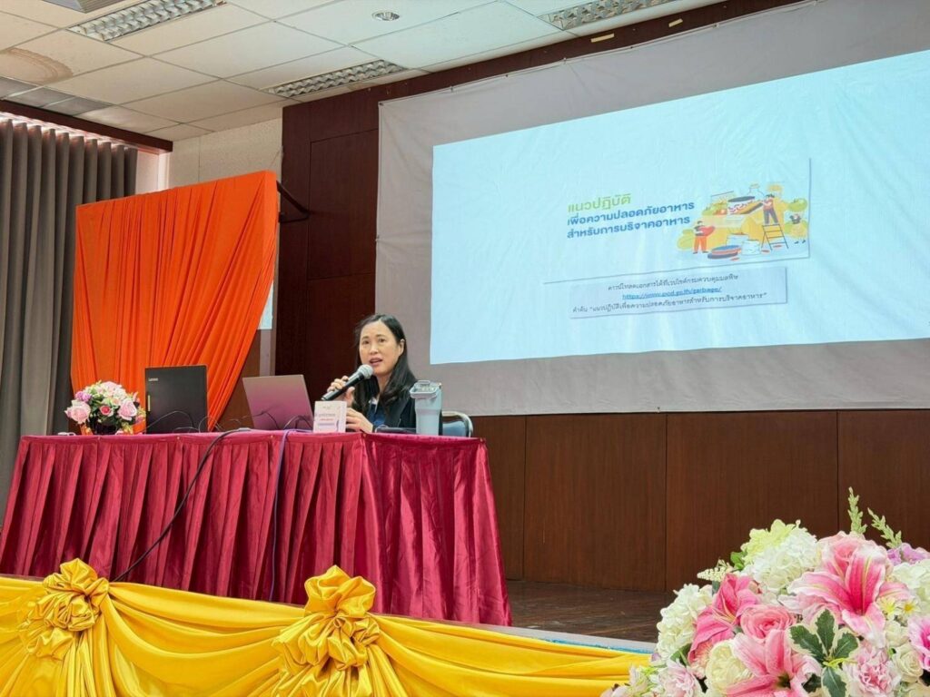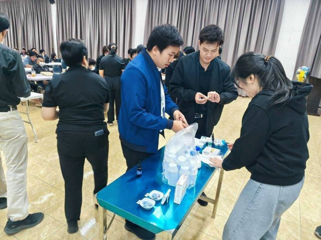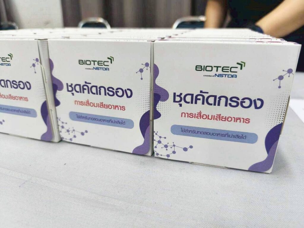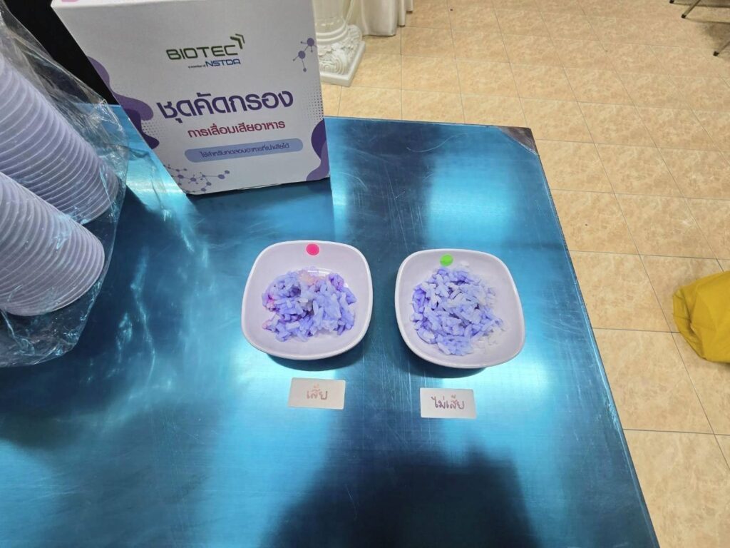 ในช่วงเช้าของการอบรม ดร.นิภา โชคสัจจะวาที นักวิจัยอาวุโสจากทีมวิจัยเทคโนโลยีชีวภาพทางอาหาร ไบโอเทค ได้นำเสนอแนวทางการบริหารจัดการคุณภาพและความปลอดภัยทางอาหาร (Food Safety Guideline) โดยเน้นย้ำว่าหัวใจสำคัญของการส่งต่ออาหารส่วนเกินไม่ใช่เพียงการส่งมอบให้ถึงมือผู้รับเท่านั้น แต่ต้องอยู่บนพื้นฐานของสุขอนามัยที่ดีด้วย เทคโนโลยีจึงเข้ามามีบทบาทสำคัญในการตรวจสอบและควบคุมมาตรฐาน ตั้งแต่กระบวนการคัดแยก การบรรจุ ไปจนถึงระบบการขนส่งที่รัดกุม เพื่อลดความเสี่ยงจากการปนเปื้อนและรักษาคุณค่าทางโภชนาการของอาหารจากต้นทางสู่ปลายทางอย่างเป็นระบบ ทั้งนี้ คณะผู้วิจัยของไบโอเทคได้สาธิตการใช้ชุดคัดกรองการเสื่อมเสียของอาหารในการทดสอบตัวอย่างอาหารบริจาค และได้แจกจ่ายชุดคัดกรองจำนวน 50 ชุดให้เจ้าหน้าที่เขตของ กทม. นำไปทดลองใช้ในกระบวนการเข้ารับและกระจายอาหารส่วนเกิน