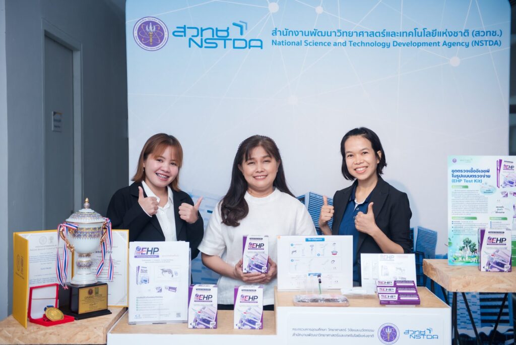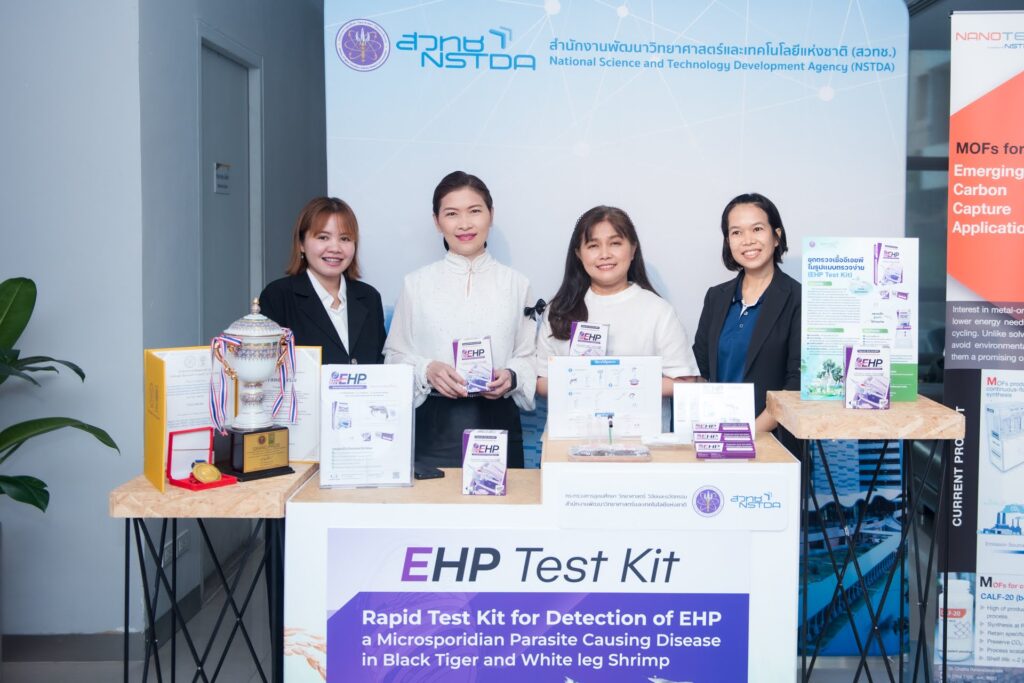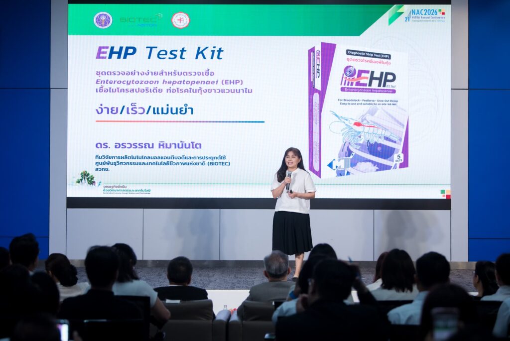 9 มีนาคม 2569 ณ ห้องแถลงข่าว กระทรวง อว. – สวทช. ได้จัดงานแถลงข่าวประกาศความพร้อมการจัดงานประชุมวิชาการประจำปี NAC2026 โดยหนึ่งในไฮไลต์เด่นที่นำมาโชว์ในงานคือผลงานจากไบโอเทค “การตรวจเชื้ออีเอชพีอย่างง่าย (EHP)” สำหรับอุตสาหกรรมการเพาะเลี้ยงกุ้ง ช่วยเกษตรกรผู้เลี้ยงกุ้งเปลี่ยนการตรวจโรคในห้องแล็บที่ล่าช้า มาเป็นการตรวจภาคสนามที่รู้ผลไวภายใน 25 นาที คัดกรองกุ้งแคระแกร็นได้ตั้งแต่ต้นทาง ลดความเสียหายทางเศรษฐกิจมหาศาลจากโรคระบาดได้อย่างทันท่วงที