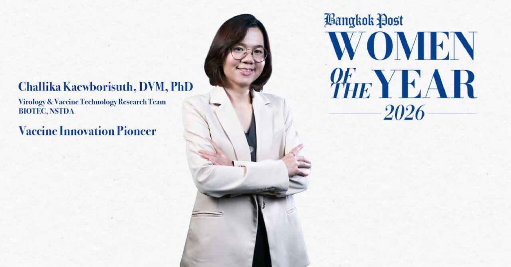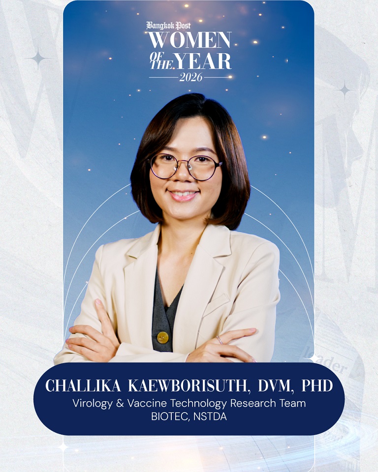 Challika Kaewborisuth, DVM, PhD, from the Virology and Vaccine Technology Research Team at National Center for Genetic Engineering and Biotechnology (BIOTEC), National Science and Technology Development Agency (NSTDA), has been honoured as one of the distinguished recipients of the Bangkok Post Women of the Year 2026 by Bangkok Post.