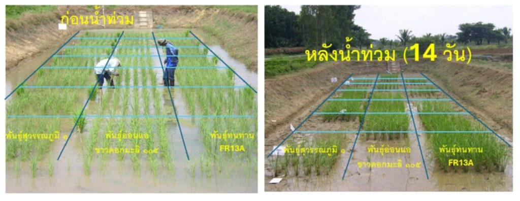 - ทนทานต่อน้ำท่วมฉับพลัน (ระยะแตกกอ นาน ๑๔ วัน ภายใต้สภาวะน้ำใส)