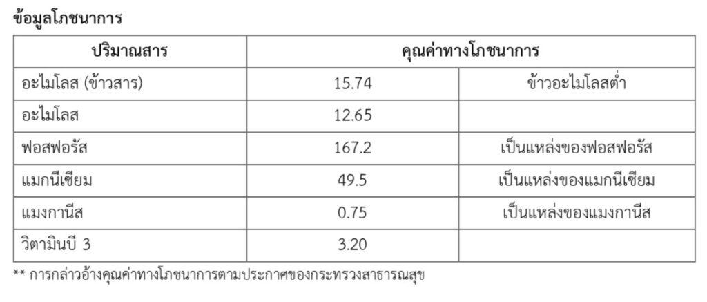 - ขนาดเมล็ดข้าวสาร ยาว x กว้าง x หนา = ๗.๖๗ x ๒.๐๘ x ๑.๗ มิลลิเมตร
