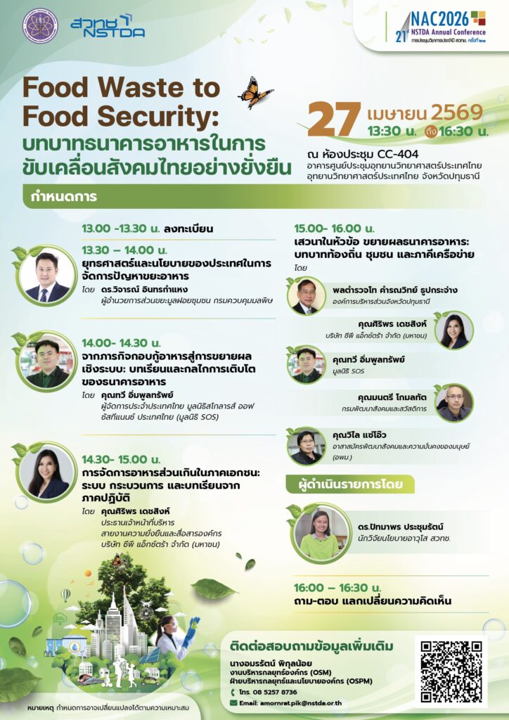 ร่วมค้นหาคำตอบในเวทีสัมมนางานประชุมวิชาการประจำปี สวทช. ครั้งที่ 21 (NAC2026) หัวข้อ “Food Waste to Food Security: บทบาทธนาคารอาหารในการขับเคลื่อนสังคมไทยอย่างยั่งยืน”