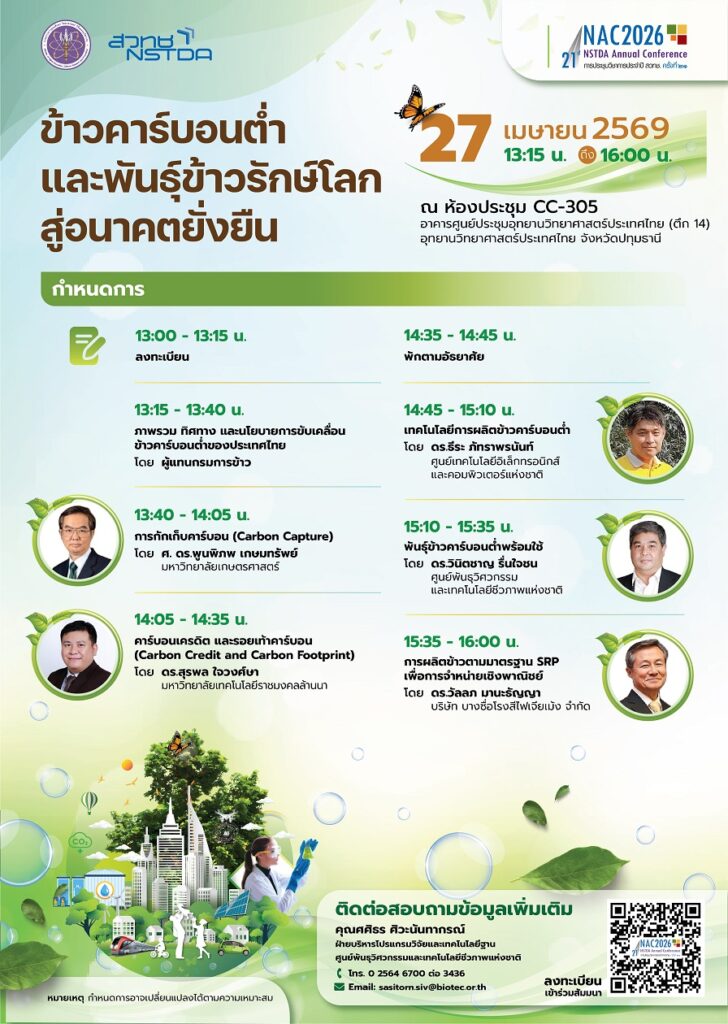 ศูนย์พันธุวิศวกรรมและเทคโนโลยีชีวภาพแห่งชาติ (ไบโอเทค) สำนักงานพัฒนาวิทยาศาสตร์และเทคโนโลยีแห่งชาติ (สวทช.) ขอเชิญชวนทุกท่านเข้าร่วมการสัมมนาเรื่อง ข้าวคาร์บอนต่ำและพันธุ์ข้าวรักษ์โลกสู่อนาคตยั่งยืน ภายใต้การประชุมประจำปี 2569 สวทช.