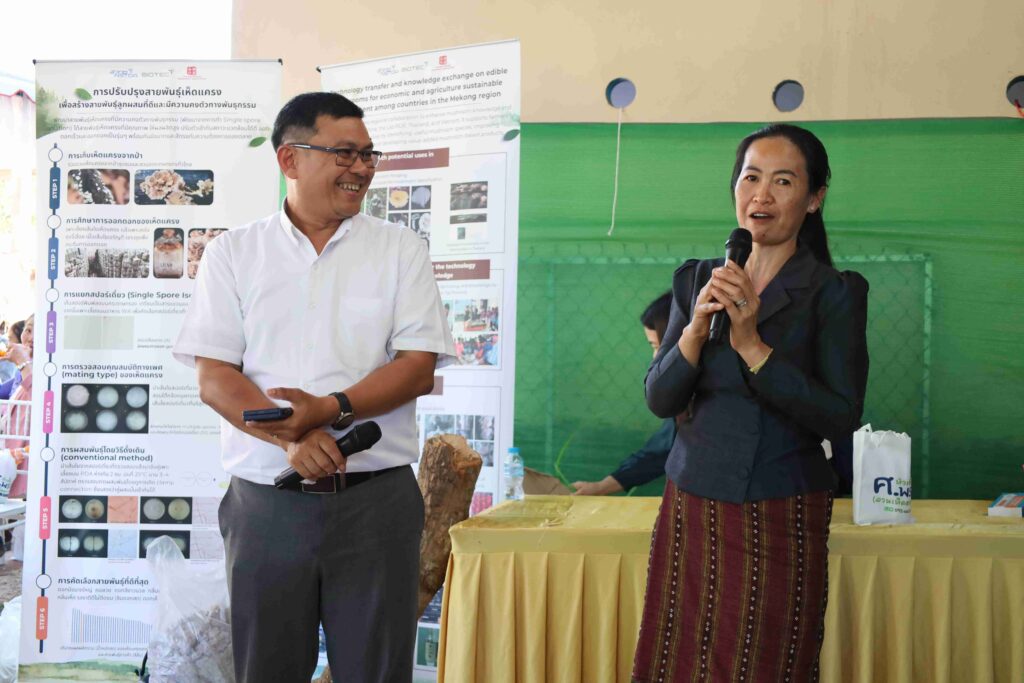 ดร.เกรียงไกร โมสาลียานนท์ ผู้อำนวยการกลุ่มวิจัยเทคโนโลยีชีวภาพพืชและการจัดการแบบบูรณาการ ไบโอเทค สวทช. กล่าวว่า กิจกรรมการอบรมเชิงปฏิบัติการเรื่อง “การเพาะเห็ดเศรษฐกิจเพื่อการพัฒนาอย่างยั่งยืน” จัดขึ้นเพื่อถ่ายทอดองค์ความรู้เรื่องการเพาะเห็ดเศรษฐกิจแก่กลุ่มเป้าหมายใหม่ใน สปป.ลาว พร้อมกับติดตามผลและประเมินการนำองค์ความรู้ไปใช้ของผู้ที่เคยเข้าอบรมในประเทศไทย เพื่อให้คำปรึกษาเชิงลึกและแนะนำการพัฒนาการเพาะเห็ดตามบริบทของพื้นที่ และเพื่อส่งเสริมการพัฒนาเศรษฐกิจฐานรากผ่านเทคโนโลยีการเพาะเห็ดอย่างยั่งยืน โดยได้เน้นการถ่ายทอดเทคโนโลยีที่ใช้งานได้จริงอย่างครบวงจร ตั้งแต่ต้นน้ำคือการคัดเลือกสายพันธุ์เห็ดที่เหมาะสมกับสภาพพื้นที่ การเตรียมหัวเชื้อที่บริสุทธิ์ ไปจนถึงปลายน้ำอย่างการบริหารจัดการต้นทุนและการแปรรูปวัสดุเหลือใช้ทางการเกษตรเพื่อเพิ่มมูลค่า นอกจากนี้ยังใช้เป็นเวทีรับฟังความเห็นจากคนในพื้นที่ เพื่อเตรียมขยายผลเฟส 2 ให้ตอบโจทย์วิถีชีวิตเกษตรกรในภูมิภาคลุ่มน้ำโขงอย่างเป็นรูปธรรม