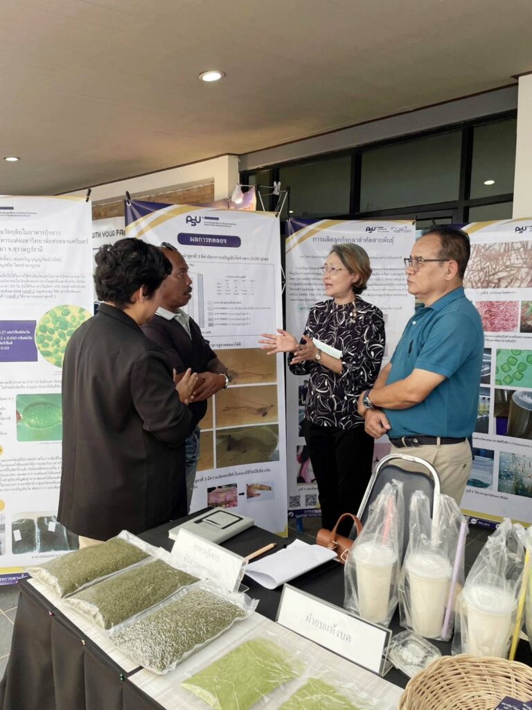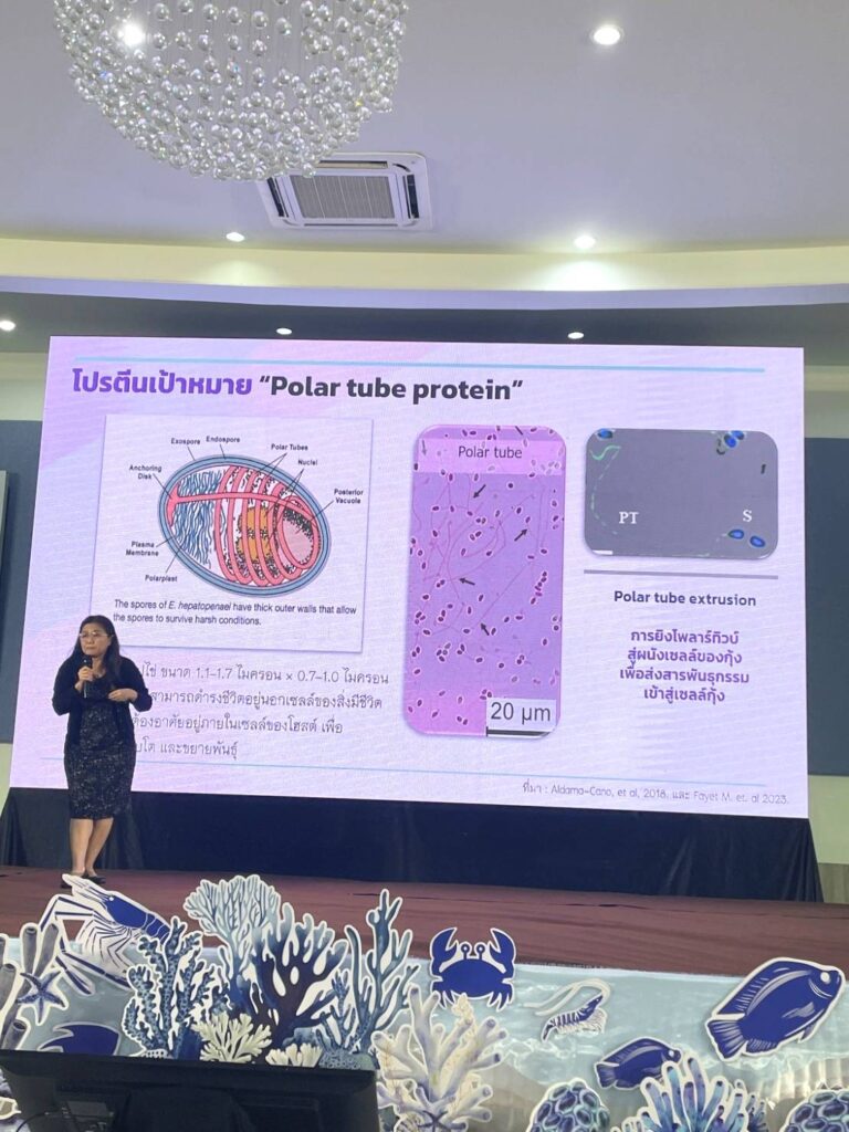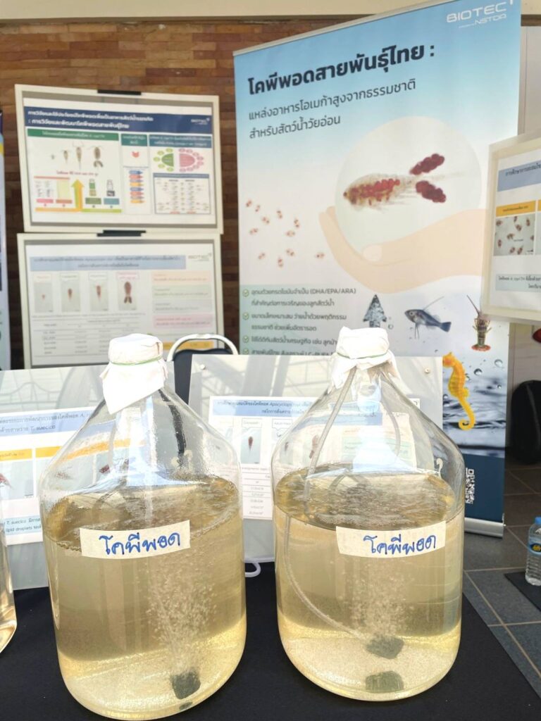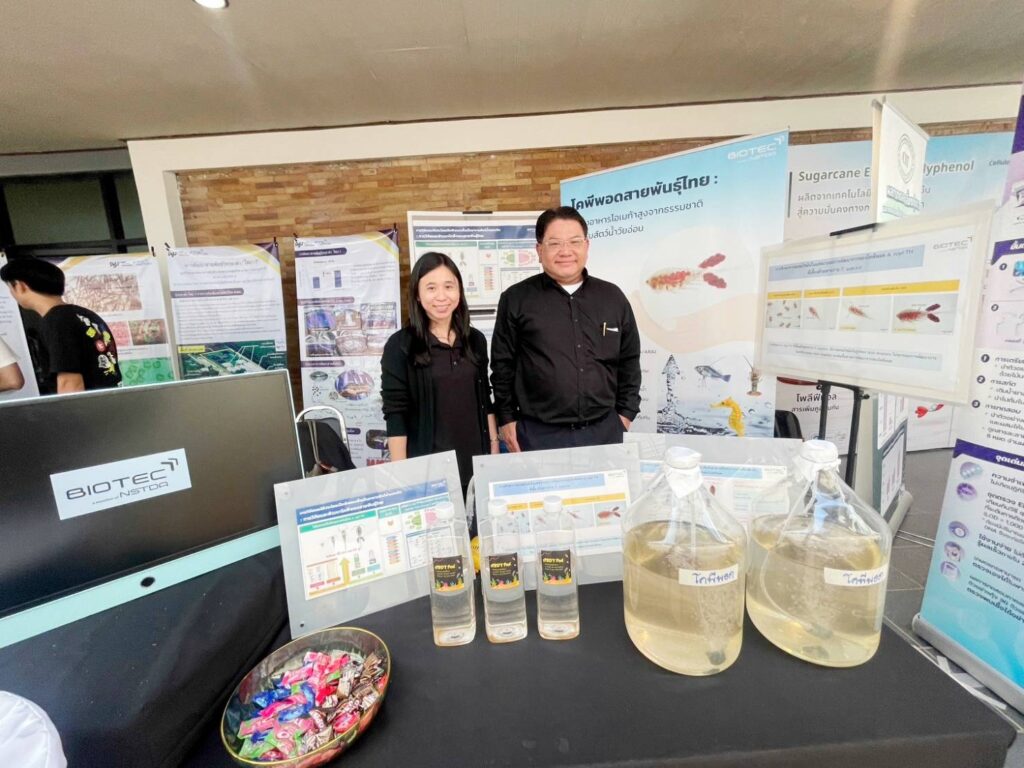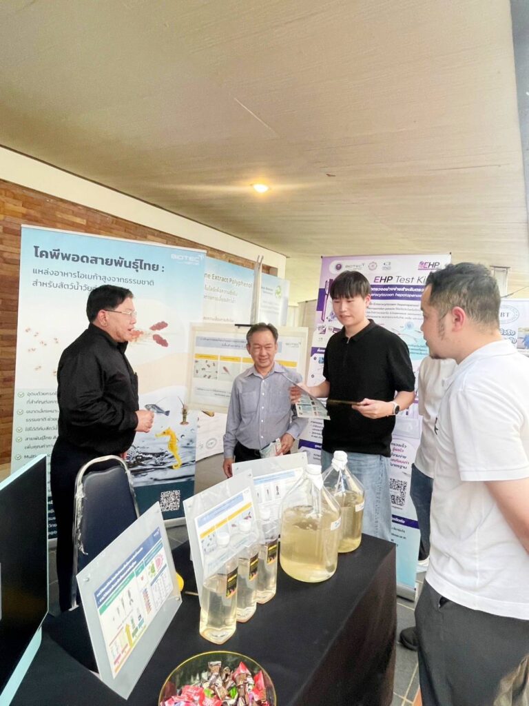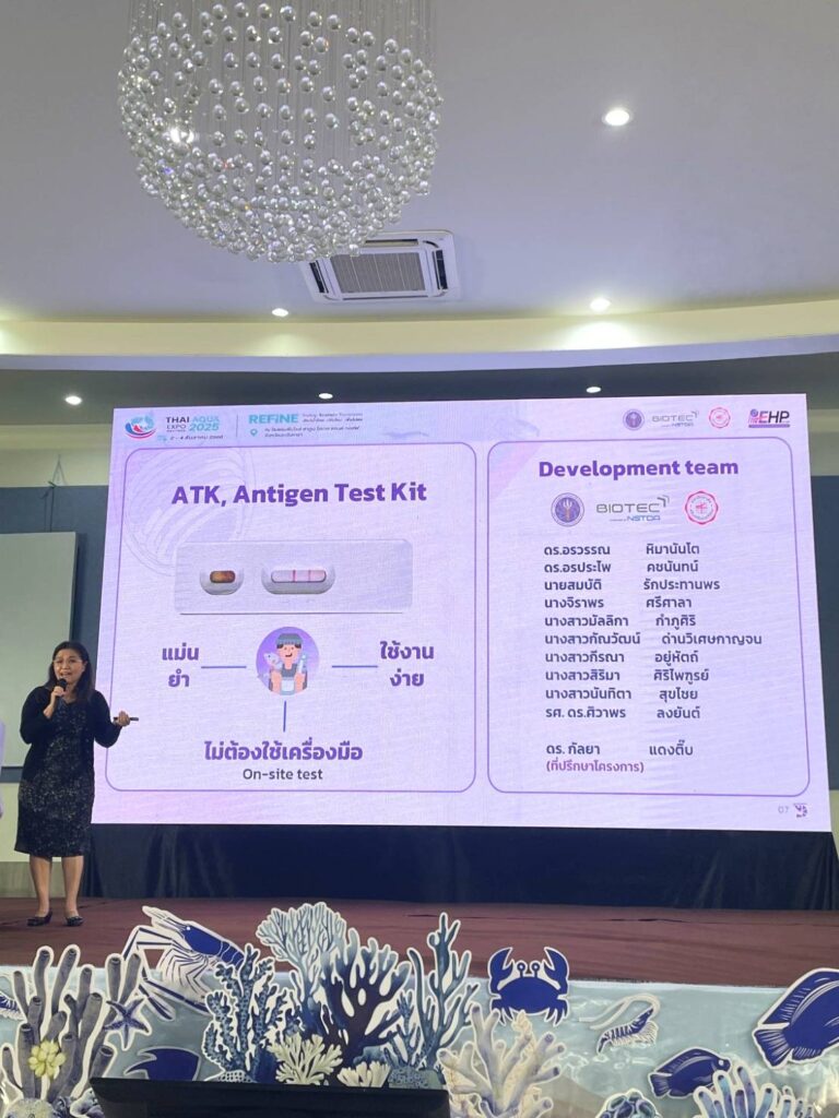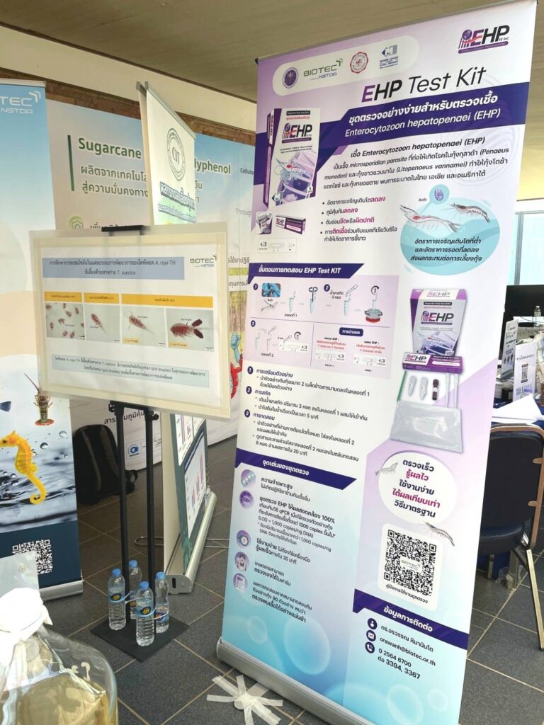 ในโอกาสนี้ ไบโอเทค ได้นำเสนอผลการพัฒนาสายพันธุ์กุ้งกุลาดำ “ไชยา 1” โดยศูนย์วิจัยและพัฒนาสายพันธุ์กุ้ง (ศวพก.) ต.พุมเรียง อ.ไชยา จ.สุราษฎร์ธานี ที่เป็นความร่วมมือระหว่าง สวทช. กับมหาวิทยาลัยสงขลานครินทร์ และเทคโนโลยีการผลิต โคพีพอด (Copepod) ซึ่งเป็นอาหารสัตว์น้ำวัยอ่อนที่มีคุณค่าสูง รวมถึงยังมีการบรรยายนำเสนอชุดตรวจโรค EHP (Enterocytozoon hepatopenaei) ในกุ้ง โดย ดร.อรวรรณ หิมานันโต หัวหน้าทีมวิจัยการผลิตโมโนโคลนอลแอนติบอดีและการประยุกต์ใช้ จากไบโอเทค บนเวทีสัมมนาในงานด้วย
